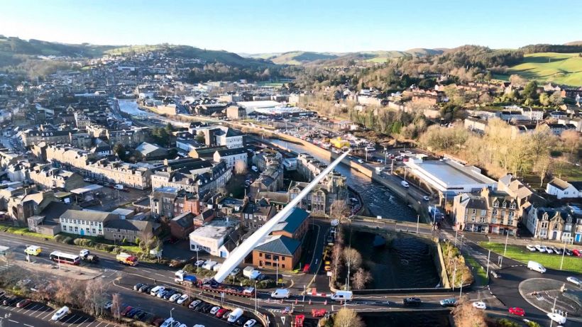 La pala, una delle 21 destinate al parco eolico di Pine Burns, a Hawick, in Scozia è stata trasportata in posizione semi-verticale da una tir-gru specializzato per i paesini della Scozia del sud.