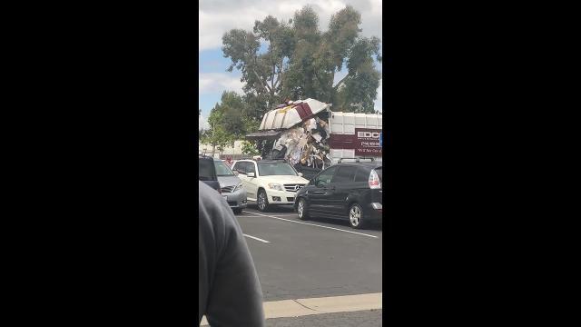 Una manovra errata (o voluta?!?) del camionista e l’intero carico di spazzatura si rovescia sulla macchina. Un errore o una vendetta? Secondo i presenti, più probabile che si tratti della seconda…